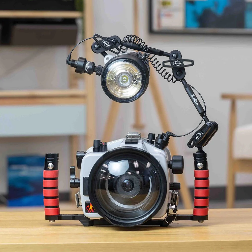 - Allows you to disconnect your strobe cords underwater. For example, if you want to shoot some split shots using natural light at the end of a dive without the extra weight of your strobes, you can easily disconnect the fibre optic cords and use our unique quick release mount to disconnect your strobe arms.
